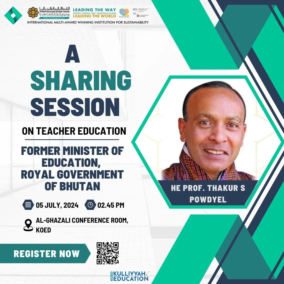 A Sharing Session on Teacher Education Friday, July 5, 2024 2:45 PM 3:45 PM Al-Ghazali Conference Room, KOED Jalan Gombak Kuala Lumpur, Selangor, 53100 Malaysia (map) Google Calendar ICS Join former Minister of Education of the Royal Government of Bhutan for a sharing session on teacher education, hosted by the Kulliyyah of Education, International Islamic University Malaysia (IIUM).Register to attend in-person.Join the Zoom Meeting.