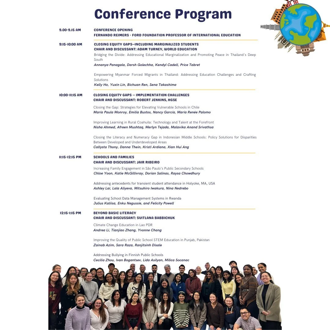 At this conference, graduate students in the course Education Policy Analysis and Research in Comparative Perspective, taught by Professor Fernando M. Reimers, with the assistance of Mohammed Begi, Jolyn Chia, Sooty Heng, Nam Nguyen, and Margaret Wang, at the Harvard Graduate School of Education, will share the result of their work with government leaders around the world examining how education policy reform can address emerging issues in education systems around the world. Their work will be discussed by global leaders of thought and practice in international development.