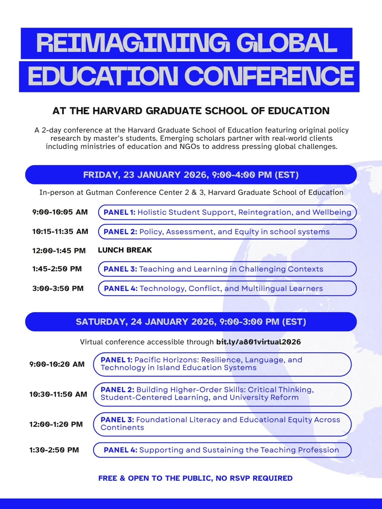 This January, the Harvard Graduate School of Education invites you to join a two-day conference on global education, featuring original policy research and analysis conducted by HGSE master’s students.